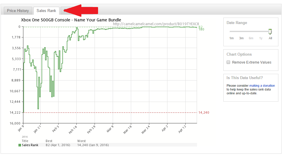 The next tab is the Sales Rank tab. This tab is awesome because it allows us to track the product fluctuations in Sales Rank over time. We can use this alongside the Price history tool to find out when we can sell the most of a product at the highest profit margin.