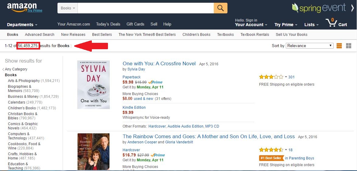 In the picture below you can see that there are 56,459,275 books listed in Amazon’s Books Category. That means that the #100,000 ranked books were selling in the Top 1% of Books.