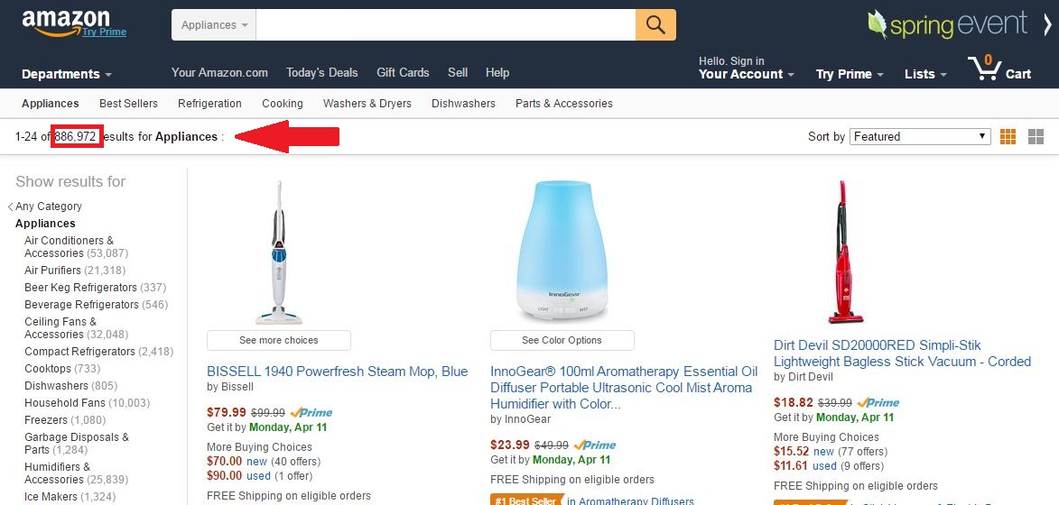 Now let’s take a look at how the #100,000 ranked products in the Appliance category. As you can see in the picture below there are 916,800 products in the Appliances category. That means that the #100,000 ranked Appliance is selling in the top 11% in its category. That is also pretty good but the amount of sales that the Appliance would get would be nowhere near the amount sales that the Book would get.