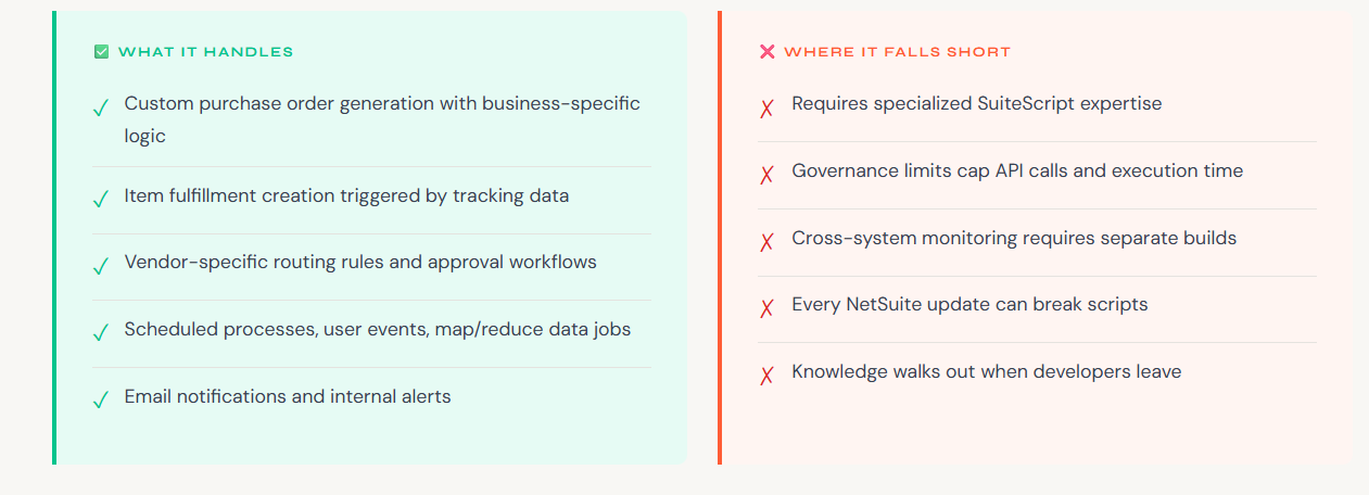 Real-world scenario: A dropship retailer builds a SuiteScript to auto-create purchase orders. It works at 500 orders/day. At 5,000 orders/day, they hit governance limits mid-batch. The “automated” system becomes manual intervention; exactly what they were trying to avoid.
