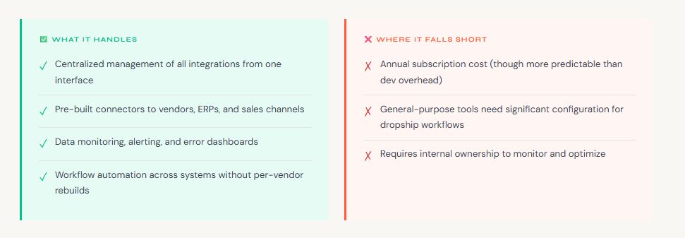 iPaaS platforms are the right architectural choice for multi-vendor dropship operations. The key differentiation is whether the platform is general-purpose or purpose-built for ecommerce and dropshipping; that distinction determines how much configuration work remains after deployment.