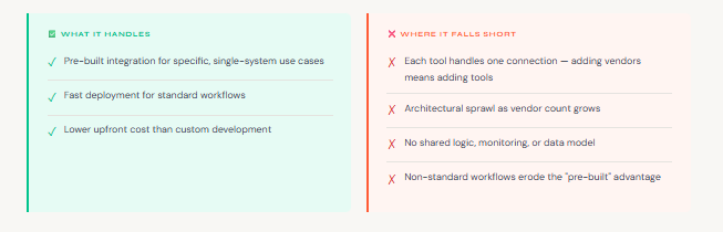 RESTlets are powerful when your team has deep NetSuite architecture experience and a small number of well-defined integrations. They become brittle when you’re managing 20+ vendor connections, each with its own requirements and update cadence.