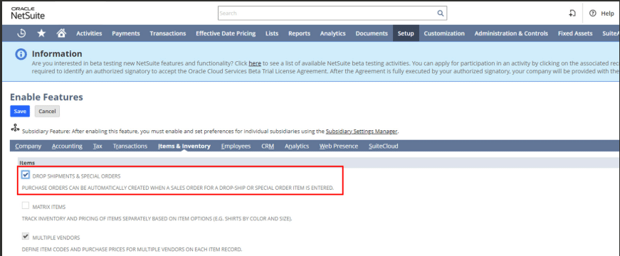 Navigate to Setup > Company > Enable Features. Under the Items & Inventory tab, check “Drop Shipments & Special Orders.” This unlocks dropship checkboxes on item records and enables automatic purchase order generation.