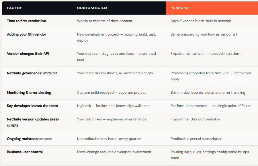 Custom development is built. Flxpoint is buy. The buy option delivers proven workflows refined across thousands of NetSuite onboardings — not a blank canvas that requires reproducing that learning from scratch at your expense.