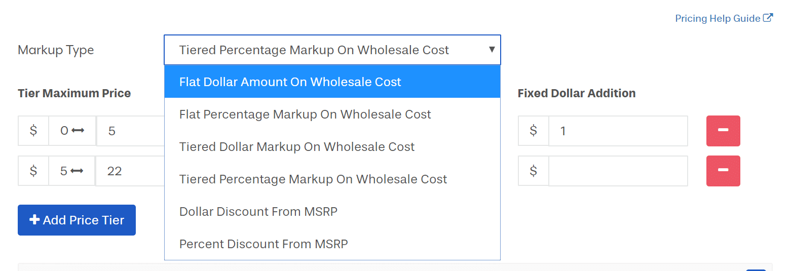 Fixed Dollar Addition: All products will have “X” amount added to their listing price.