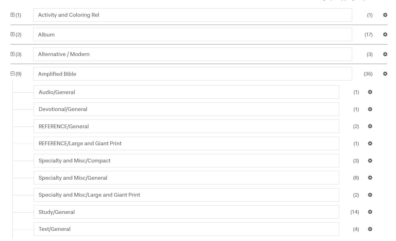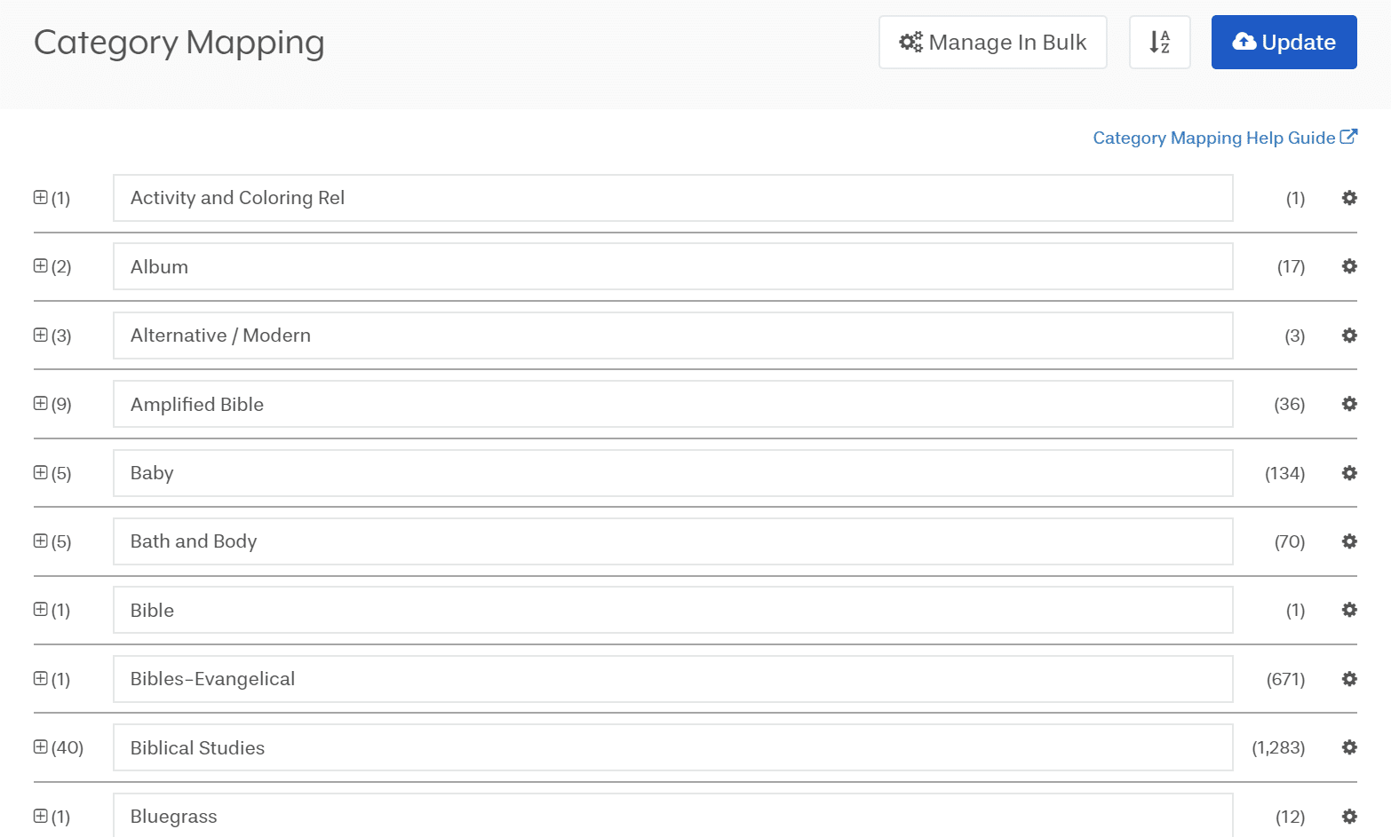The basic layout of the Category Mapping section is a tiered category structure. To the right, you can see the list of “Parent” categories, each with a small number to their left denoting the number of “Child” categories under them.
