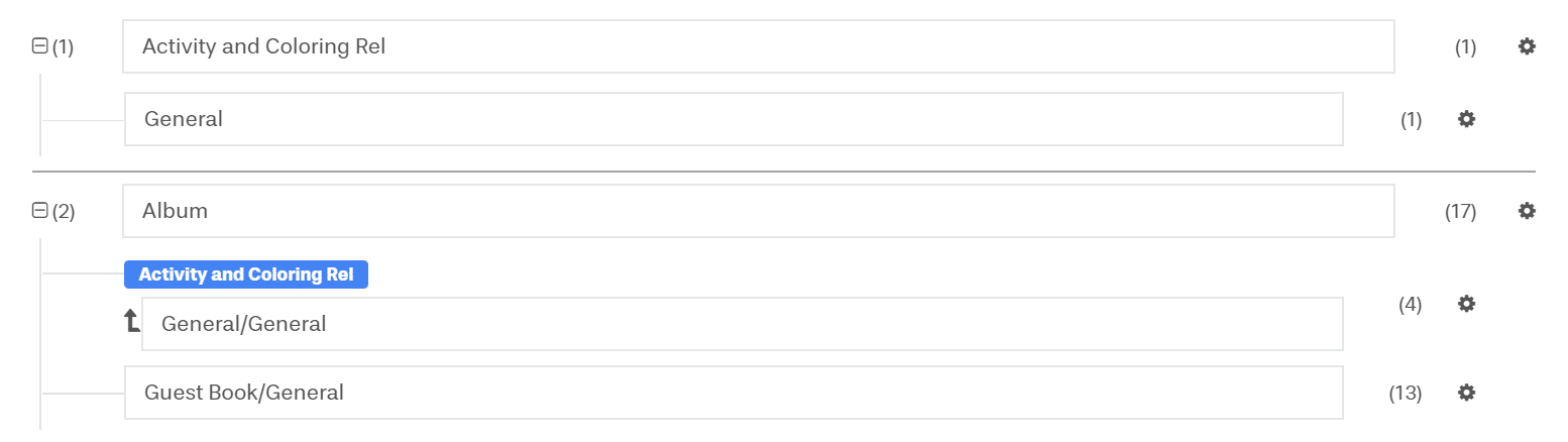 In the example to the left, the child category “General/General”under the parent category “Album” has been moved to the “Activity and Coloring Rel” Parent Category. This would populate on the website as: