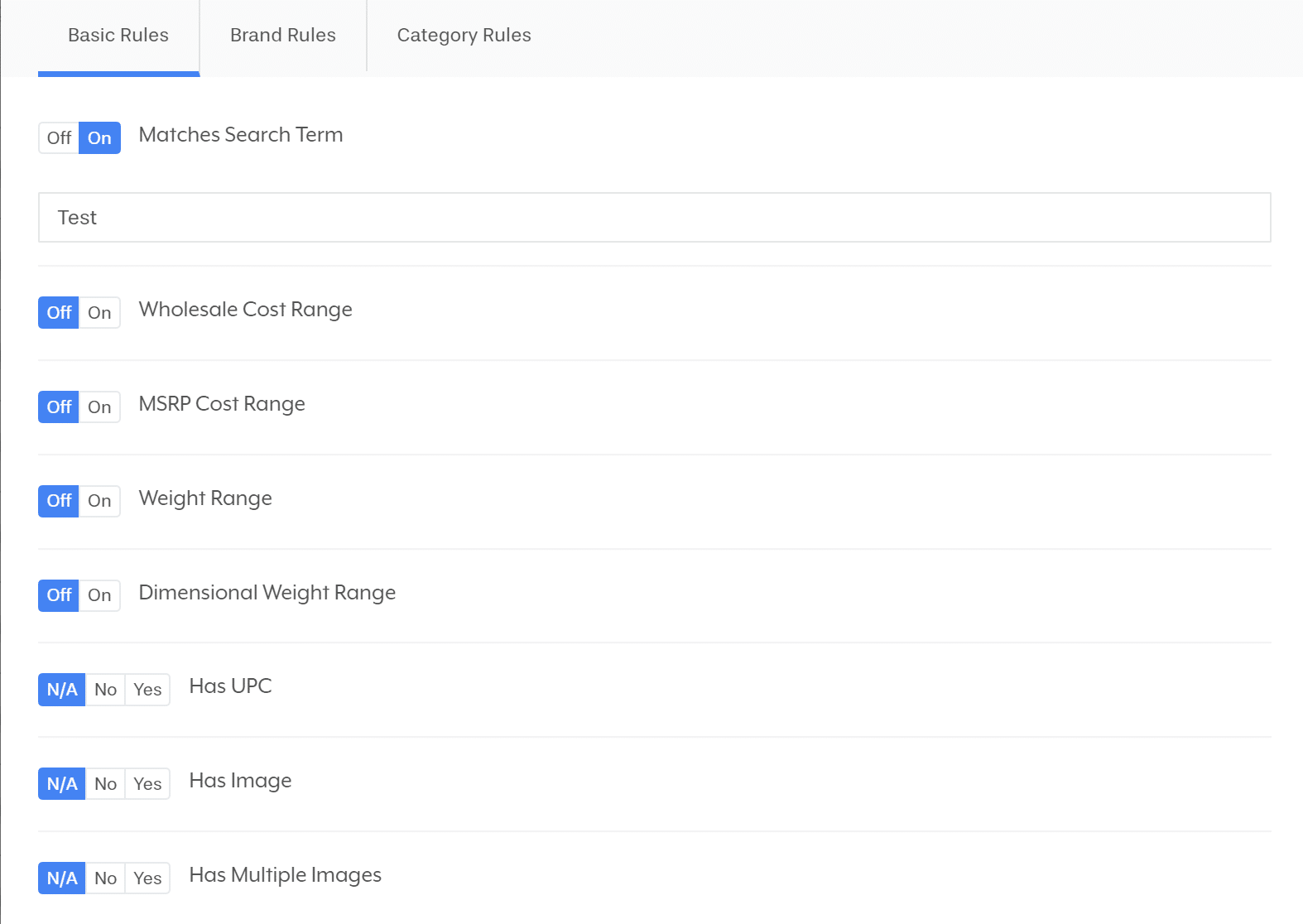 For example, you might want only products with the term “Organic” in their description or title, so they would click “On” Matches search term and type in “Organic”. You may also be selling on Amazon, so you will need that product to have a UPC, in this case they would have both the “Matches Search Term” and the “Has UPC” filters on.