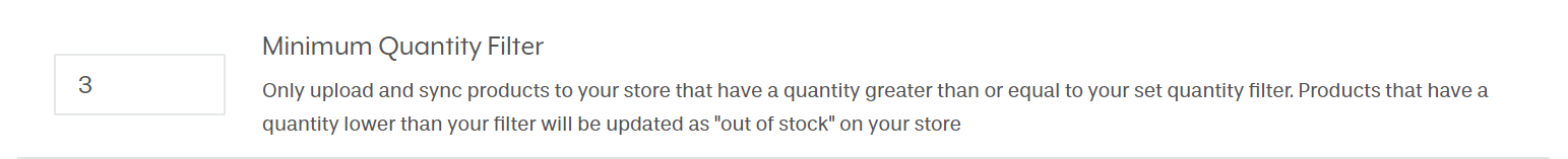 We typically recommend having this set to at least 5 for most customers. Using 5 as an example, if a quantity is updated by the supplier to be <5, then that product will be marked out of stock on your website. If the product quantity sits at 6 or above, it will be counted as “In stock”.