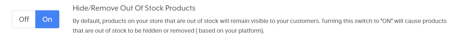 This tool will hide out of stock products from the front-end of your store. In practice, this works in conjunction with the Minimum Quantity Filter and a product falling beneath the Minimum Quantity Filter will be affected by this tool. Please note, that a platform must have the capability to hide a product for this to work.