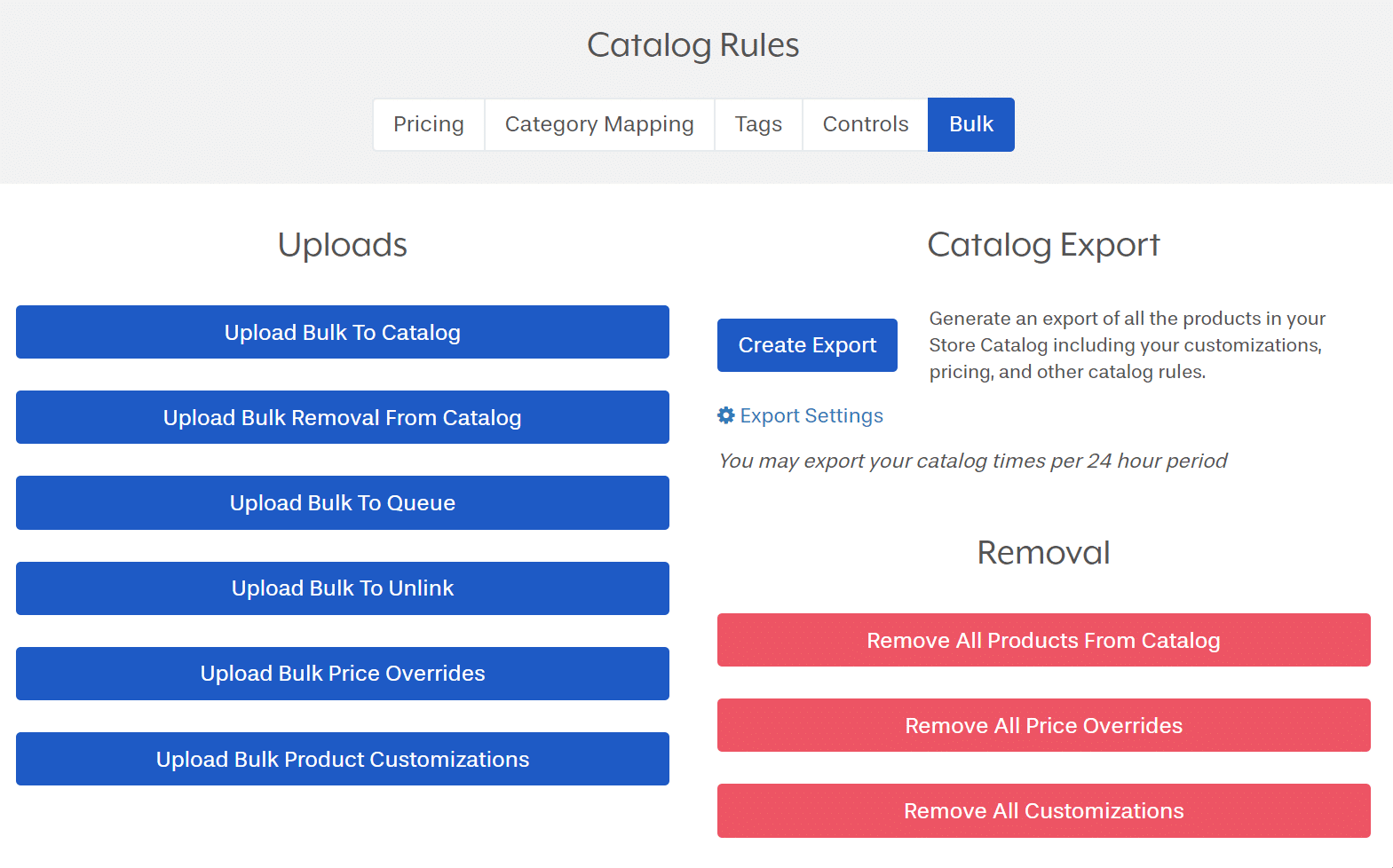 Upload Bulk Removal from Catalog: This feature does the exact opposite of the previous feature. This will remove any listed SKU from the catalog in the uploaded file.