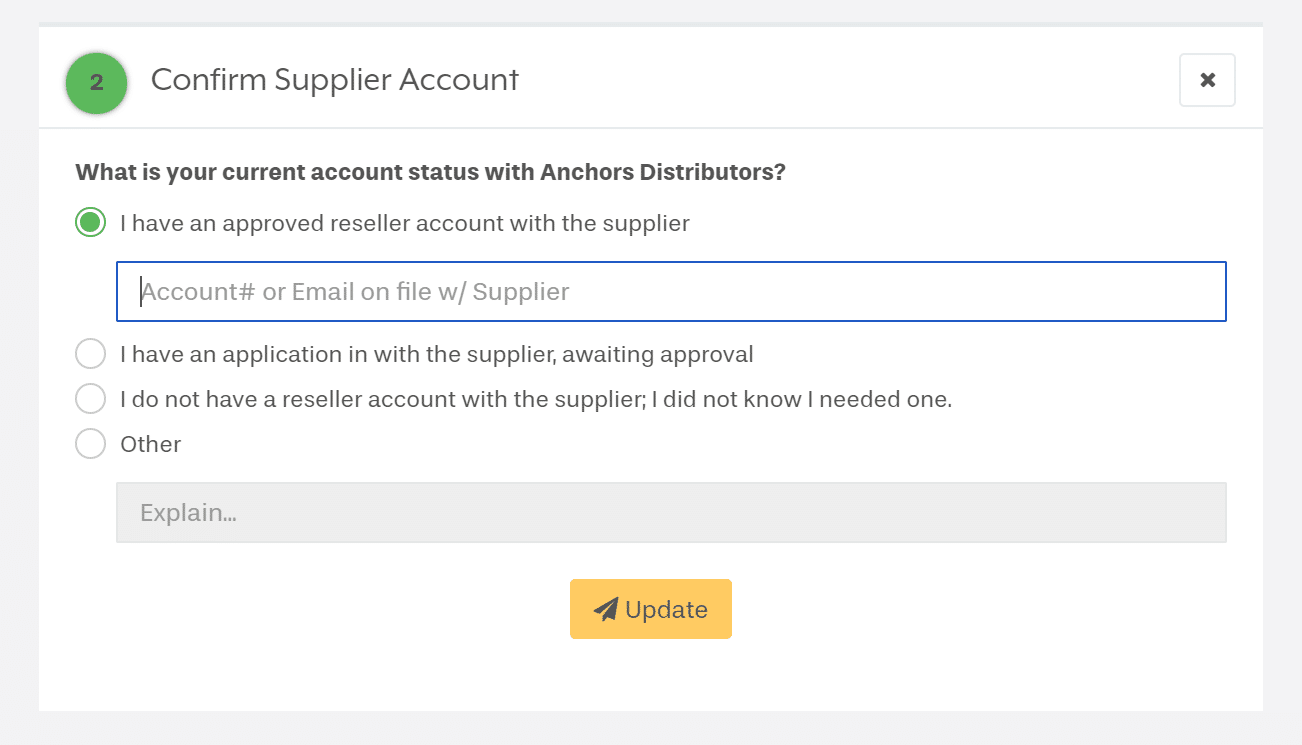 You can select “No I do not have a reseller account” “Yes I do have a reseller account,” or “I have a reseller account that is currently awaiting approval.” You will need an approved account from the supplier to start selling their products. In instances where you do not have a reseller account already, we provide a link to the suppliers website in the “Supplier Directory” tab.