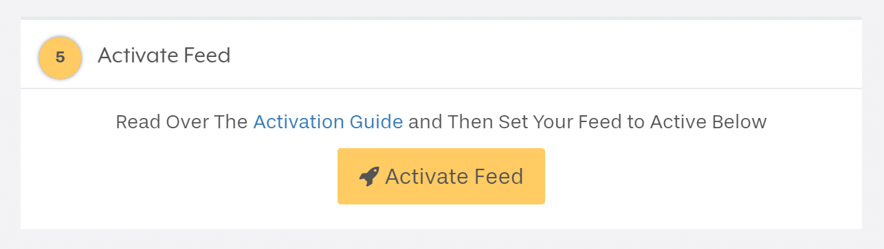 Once step 4 is complete, step 5 will populate and allow you to activate your feed. Step 5 will immediately begin a sync to your platform, pushing whatever products and whatever product rules were set in the previous 4 steps.