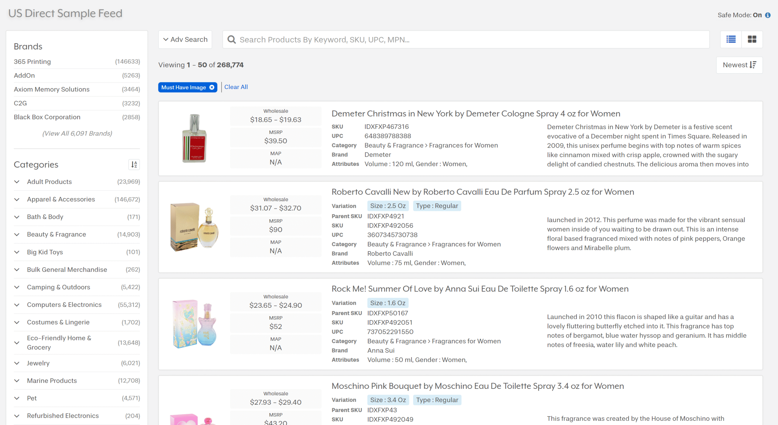 Upon selecting a supplier to research, you will be greeted with this screen. It allows you to look through their potential supplier’s catalog and see a range of wholesale prices, and what goods they offer to their resellers. For customers who are brand new to ecommerce, this is an invaluable tool for prospecting potential opportunities.