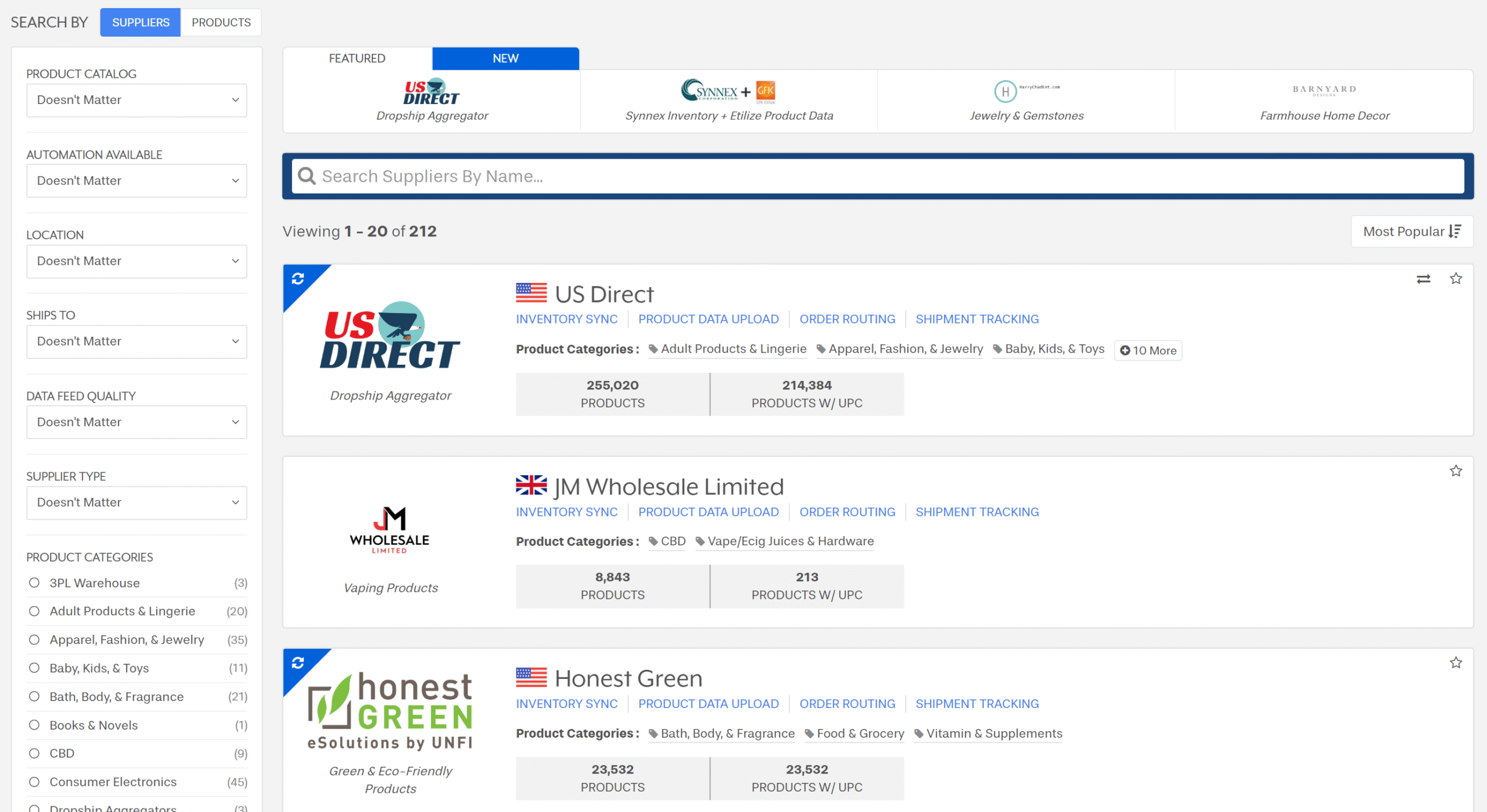 You can also filter suppliers by location, level of automation available, data feed quality, where a supplier ships to, and if they provide a product catalog for a prospective reseller to peruse.