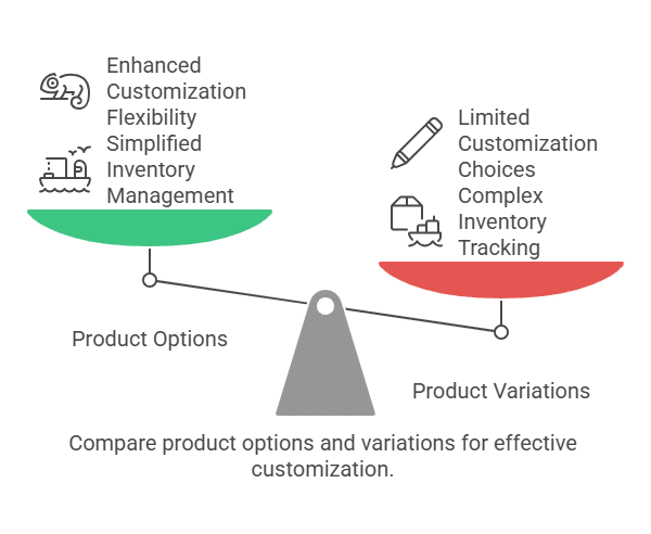 Unlike variations of products, which need separate SKUs, product options don’t add inventory complexity. They let customers personalize items without affecting stock management.