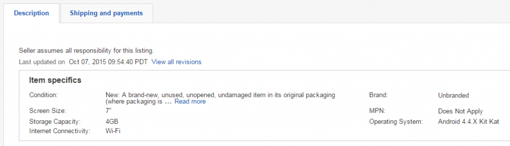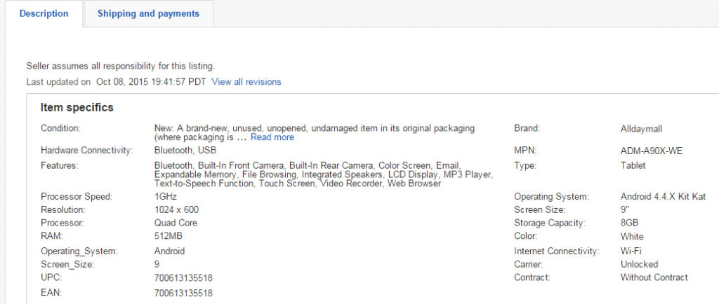 - Description: So many dropship resellers just leave the default description on their listings, but this is a chance to really add value to the listing. Often the supplier might just have a few bullet points or the most basic of details, but the buyer wants to know as much as they can about the item. Expand on the features and tell the buyer more about what the product is for, how it is used, why they need this product, or how it would solve a problem or help with a task, etc. Make sure you use a well-organized format and have a feature list. Include any size, style, color, etc., even if it’s clearly shown in the picture. Even if you don’t have a lot of details to add, just talk about the product from the image to give great new details to hook your customer. Think about the last time you went to the store to buy a new item. Let’s say it’s a new tablet. If you had the same tablet sitting in 2 boxes on the shelf in front of you and one box had the battery life details, camera specs, and added commentary like “sleek yet durable” while the other box simply said “new tablet”… which one would you buy? Finally, make sure you detail the condition. You can add that your items are new, never been opened, in the original packaging and more. There are many new and refurbished items on eBay, so when you have a new product, don’t assume that it is clear to your buyers…specifically tell them it’s new and factory sealed, etc and that is an easy way to improve your listing.