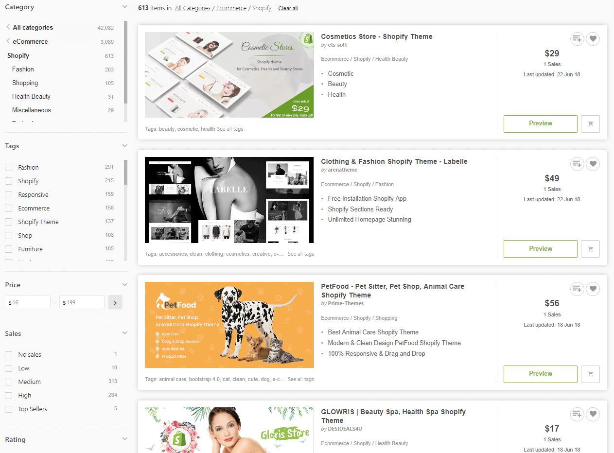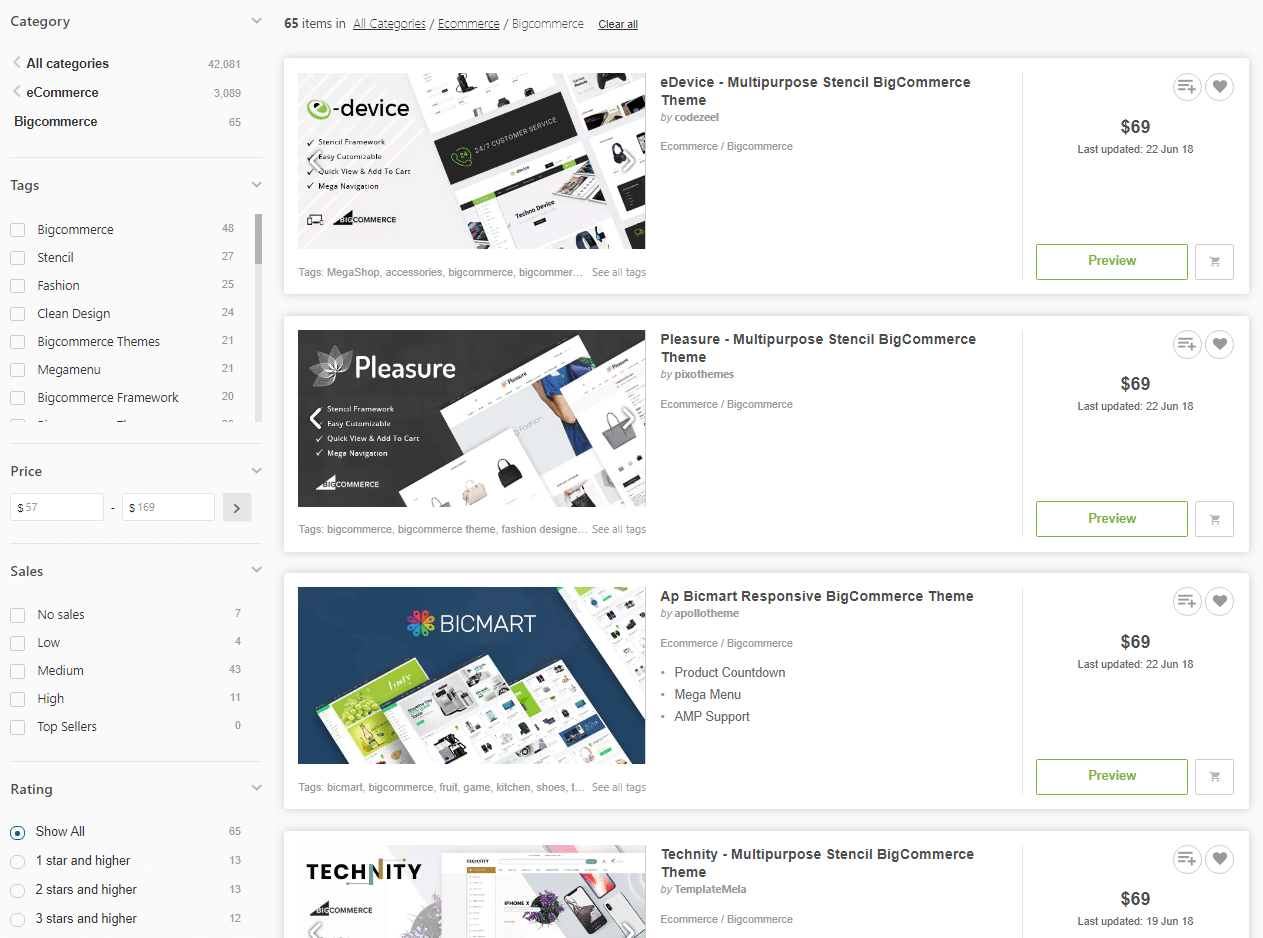 Notice that Shopify has 613 themes, whereas BigCommerce only has 65. The price for Shopify themes here starts at around $16, and BigCommerce themes tend to start out right around $69. Still more inexpensive than going through their marketplace directly, though.