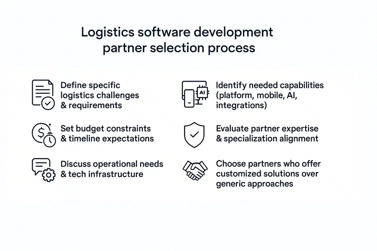 Start by clearly defining your specific logistics challenges, budget constraints, and timeline requirements. Consider whether you need a full-scale platform development, mobile applications, system integrations, or specialized features like AI-powered optimization.